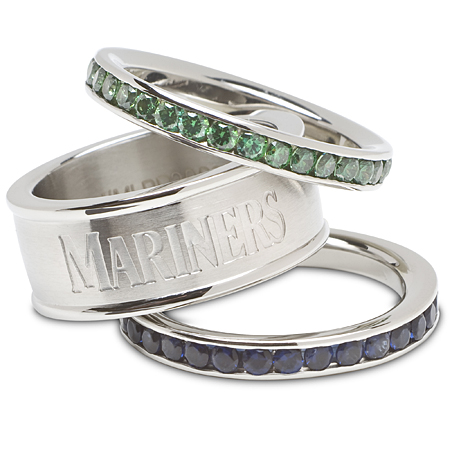 Make this Seattle Mariners cubic zirconia stacked ring set a game-time essential. Whether you're watching the Mariners game from home or live on the field, this Seattle Mariners CZ ring set is the perfect way to cheer on your favorite MLB team in style. This commemorative ring set is made of stainless steel and features green and blue team colored cubic zirconia stones. Try on this MLB officially licensed Seattle Mariners cubic zirconia stacked ring set and become the ultimate Mariners fan.