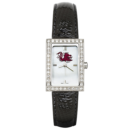 Make this ladies University of South Carolina Gamecocks watch an essential part of your traditional game day attire. Made of premium quality, this University of South Carolina watch sports the Gamecocks official logo on the white dial and is framed by sparkling white cubic zirconia stones around the rectangular casing. A black leather strap adds a striking accent and perfectly highlights the sparkling details around the dial. Get the official NCAA team look when youre wearing this black leather ladies University of South Carolina Gamecocks watch.