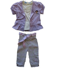 "Manufactured by: Nick Jr. Dora the explorer 3pc Pant set includes the following: Pants are green and purple and has a nice flower embroidery on bottom left and an elastic waist. Crème color short sleeve blouse with crochet design and embroider patch of Dora's name and flowers, lastly light purple jacket with a Dora with flowers embroidery. Shirt: 75% Polyester: 25% Cotton. Pant: 65% Polyester, 35% cotton. jacket:75% Polyester 25% Cotton. made in China"