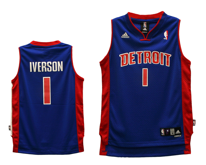 He will cheer for his favorite player IVERSON #1 with this official jersey available in color blue/red. jersey includes a V-neck DETROIT 1 at center of chest and on back side Iverson. Official NBA logo embroidery at left chest side and right side ADIDAS logo. Exterior 100% Nylon; Knit Trim Polyester
