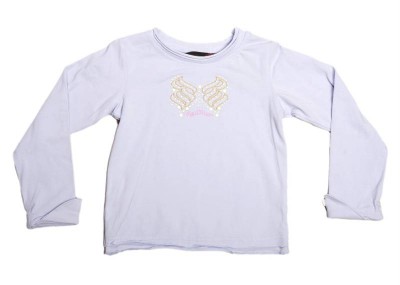 Embroidered signature logo with sequined pearl design accents chest. Gold graphic logo print gives it a nice glamorous touch. Bottom hem of tee has the look of two in one. Long sleeve tee features a crew neck and cap sleeves that are lightly folded with a button up pearl on each side. Tee is original of brand 96% Cotton 4% Spandex. Sizes 4 to 6X. Exclusive of decoration made in China.