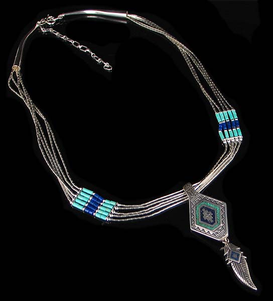Additional Info: The beautiful handcrafted sterling silver pendant is measures 71x23mm and is inlaid with genuine turquoise & lapis chips.