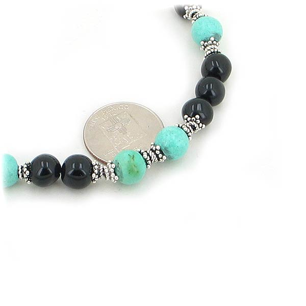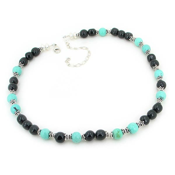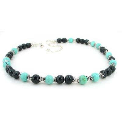 Featuring a gorgeous 1 strand necklace with 10mm onyx & turquoise beads, complemented with our beautiful sterling silver crown findings.
