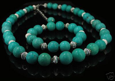 Featuring a handstrung necklace and bracelet jewelry set. The necklace is strung with 13mm center beads and graduates to 10mm beads as it progresses towards the ends. In between each pair of beads is a .925 sterling silver bali bead. It has an adjustable length of 19.5" - 22.5". The matching bracelet is also composed of these rare 13mm beads and stretches to fit most sizes.