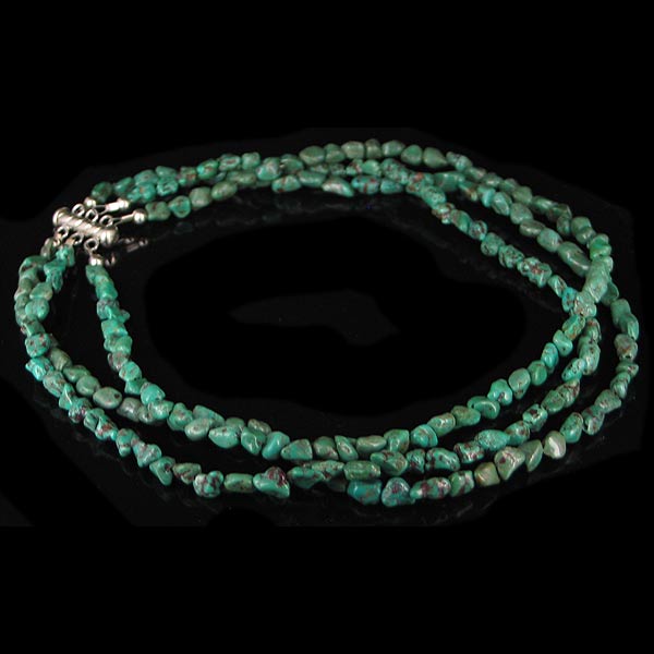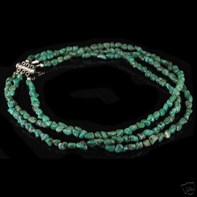Featuring a beautiful 3 strand genuine turquoise nugget necklace with .925 sterling silver beads. It has a width of 14 mm and a length of 15.5" with sterling slider clasp.