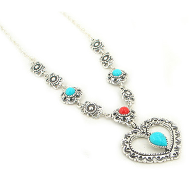 Featuring a gorgeous sterling silver bow tie link necklace with a matching heart enchaner. The links are carefully detailed and set with genuine Kingman Turquoise & Coral studs.