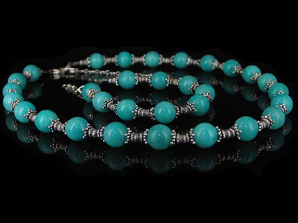 Item Description: Featuring a Gorgeous very high quality Amazonite bead necklace & bracelet set. These 10 mm beads are complmented with sterling silver crown findings and 4 mm sterling silver bali beads. The necklace has an adjustable length of 16.5" - 19.5" with sterling lobster clasp. The bracelet has a length of 7" - 8", also with sterling lobster clasp. For more details please, see box above our company logo.