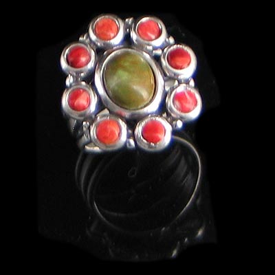 Featuring a beautiful handcrafted .925 sterling silver Sun Flower Ring, set with 8 genuine 3 mm spiny oyster studs Turquoise studs and a 7 x 9 mm genuine turquoise stone. This size 7 ring has a width of 21 mm. Good Luck and Happy Bidding!