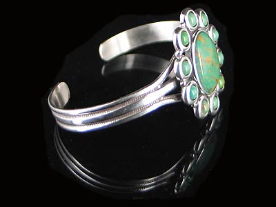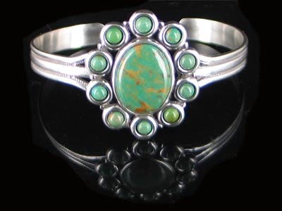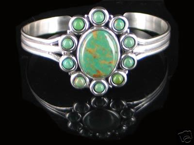 Featuring a beautiful handcrafted .925 sterling silver cuff bracelet. Each genuine turquoise stone is handset and handpicked to match. The outer stones are 12 4mm stones. The centerstone is 18x13mm. These are all genuine stones and you will receive the one in the picture. This bracelet has a maximum width of 34mm and adjusts to fit up to 7" wrists.
