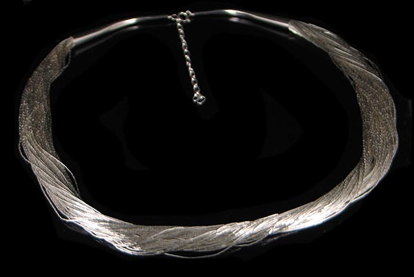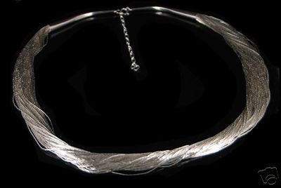 This beautiful necklace is 50 strands of handstrung .925 sterling liquid silver beads. It has an adjustable length of 24" - 28" with sterling spring ring clasp.
