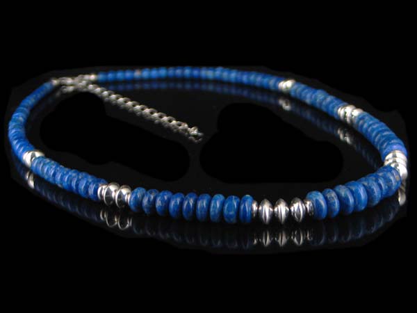 Featuring a gorgeous 1 strand genuine denim lapis bead necklace with sterling silver flatbeads. The beads are handstrung and start at 5 mm from each end and gradually increase in size up to 10 mm as they reach the center. This high quality necklace has an adjustable length of 20" - 24" with sterling lobster clasp.