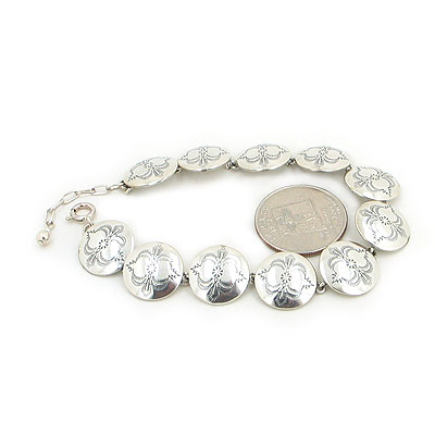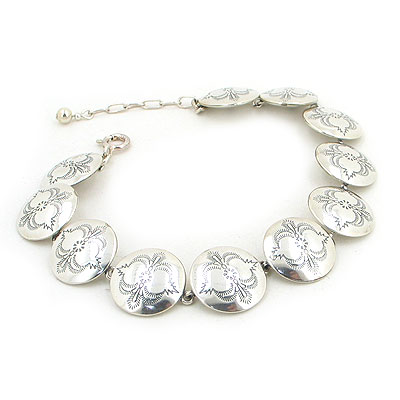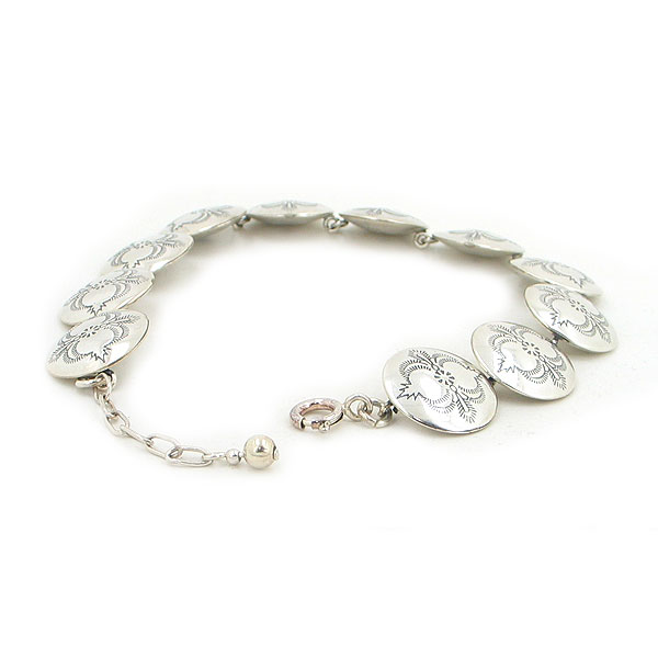 Featuring a beautiful sterling silver disc link bracelet each stamped with a unique southwestern design. It's extra long to fit 8-9" wrists.