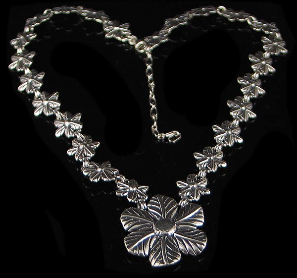 Featuring a sleek .925 sterling silver Flower Link Necklace. Each link is a handcrafted with 14 mm concho. The matching centerpiece has a length of 33 mm and a width of 30 mm. It has an adjustable length of 17.5" - 20.5" length with lobster clasp.