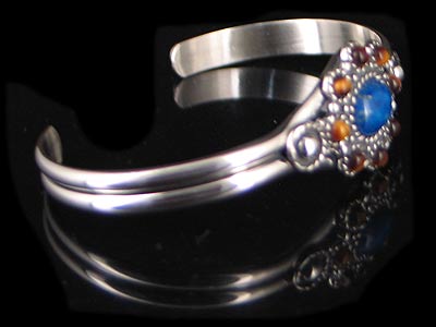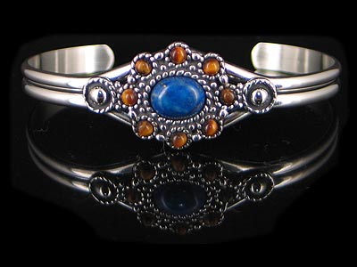 Featuring a gorgeous handcrafted .925 sterling silver cuff bracelet, set with eight 3 mm tiger eye studs and one 8 x 10 mm genuine labis stone. This cuff bracelet adjustst to fit up to 7.5" wrists.