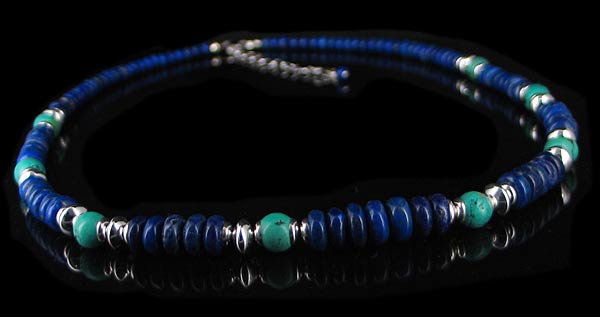 Featuring a gorgeous handstrung necklace with genuine 5 mm lapis stones that gradually increase to 9 mm lapis stones as they move towards the center of the necklace. Complementing these lapis beads are genuine 9 mm turquoise beads and sterling silver bali beads. It has an adjustable length of 23" - 26" with sterling lobster clasp. Visit my store for matching bracelet.
