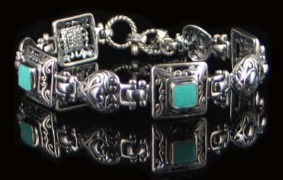 Featuring a gorgeous handcrafted .925 sterling silver link bracelet. Each link is hand detailed with an intricate filigree design. The square links are bezel set with high quality genuine turquoise, set to alternate with the smaller sterling silver filigree heart links. It has an adjustable length of 6.5" - 7.25" and a width of 14mm wight ring & toggle closure.