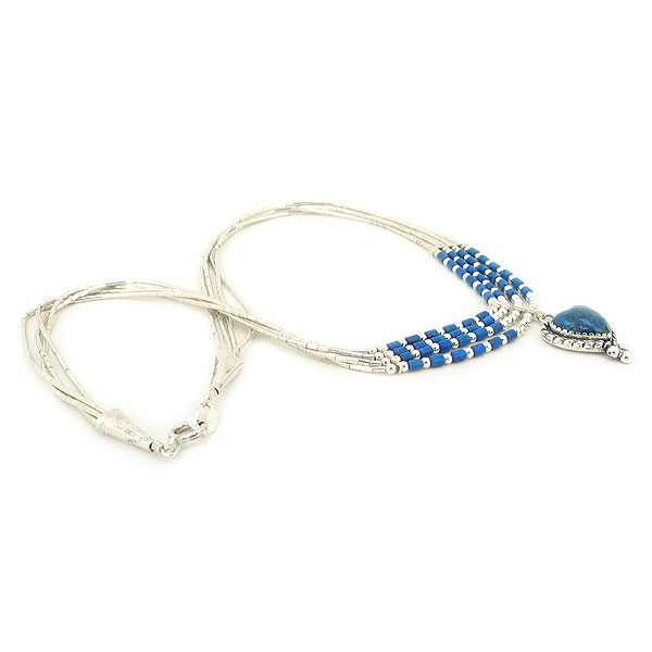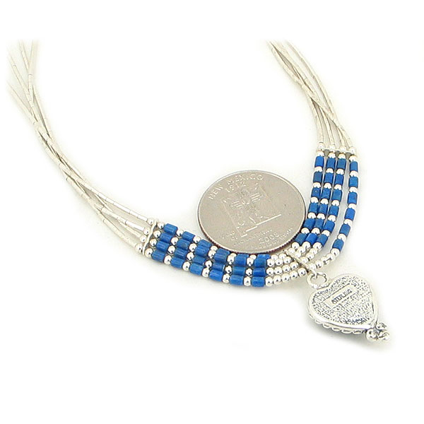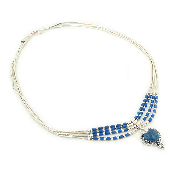 Featuring a 5 strand liquid sterling silver necklace with genuine lapis heishi beads. It also includes a matching handcrafted sterling silver pendant, set with a genuine lapis heart.