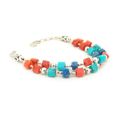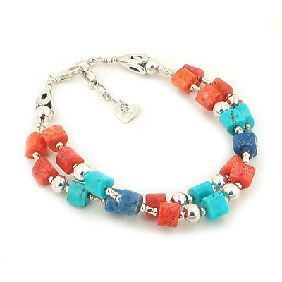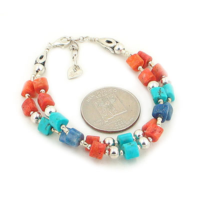 Featuring a beautiful 2 strand triangular coral, turquoise & lapis bead bracelet with sterling silver beads and findings.