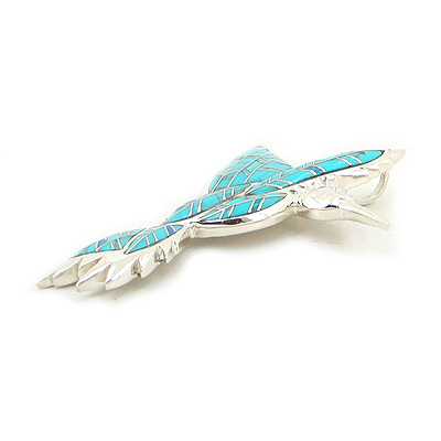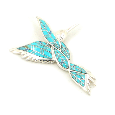 Featuring a gorgeously detailed sterling silver Hummingbird pendant, precision inlaid with genuine Kingman Turquoise & created opals.