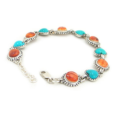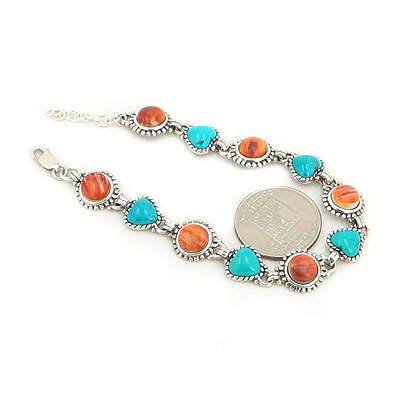 Featuring beautiful .925 sterling silver hearts and circles link bracelet set with genuine turquoise hearts and spiny oyster rounds.