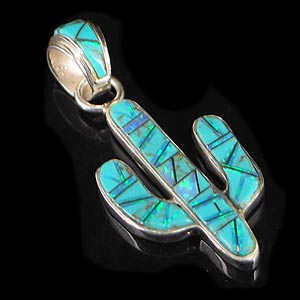 Item Description: Featuring a gorgeous medium .925 sterling silver Arizona Cactus Pendant, precision inlaid with Kingman Turquoise & fiery created opals. It has a width of 22mm and a length of 40mm. For more details please, see box above our company logo.