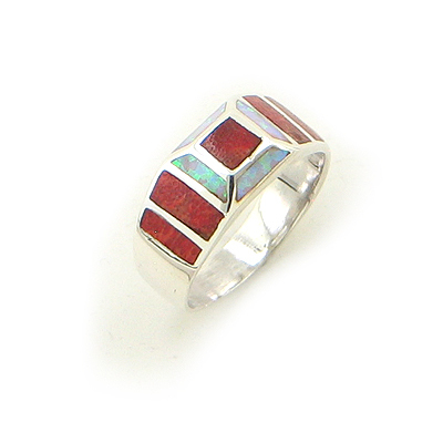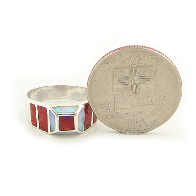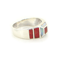 Width: 5/16" (8mm) Size: 8 Metal: .925 Sterling Silver Stone: Coral & Created Fire Opal Inlays