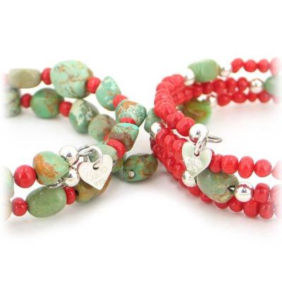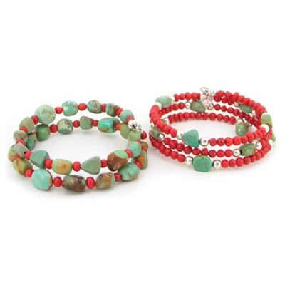 Min. Length: 7.5" (177mm) Max Length: 7.5" (177mm) Width: 1/2" (13mm) Clasp: N/A Metal: .925 Sterling Silver, Stainless Steel Memory Wire Stone: 4mm Coral Beads, ~8mm Turquoise Nuggets