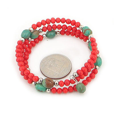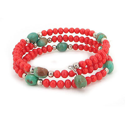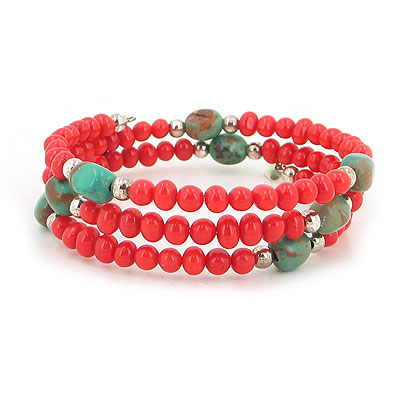 Featuring a gorgeous coral memory wire bracelet with genuine turquoise nuggets.