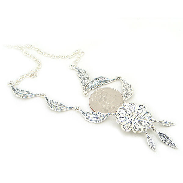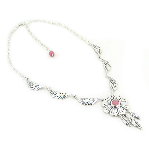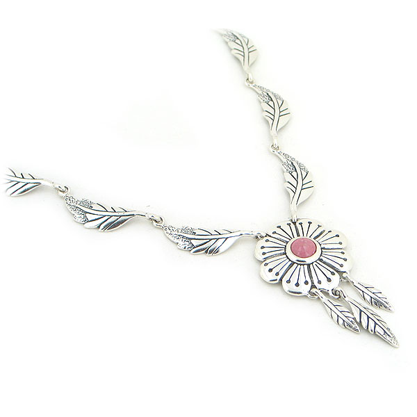 Featuring a gorgoeus handcrafted sterling silver leaf link necklace with sterling flower concho set with genuine rhodonite.