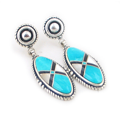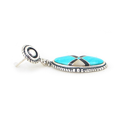 Featuring a gorgeous pair of sterling silver oval dangle earrings, precision inlaid with genuine Sleeping Beauty Turquoise, White Mother of Pearl & Onyx stones