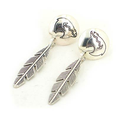 Featuring a cute pair of sterling silver bear concho earrings with sterling feather charm dangles.