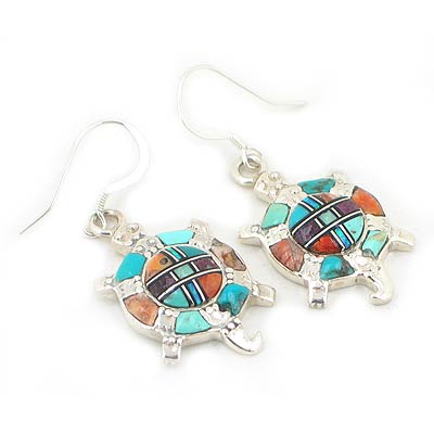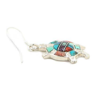 Featuring a gorgeous pair of handcrafted .925 sterling silver turtle earrings, channel inlaid with spiny oyster, turquoise, veriscite, sugilite, and created opals.
