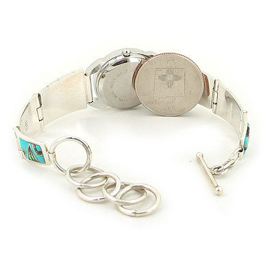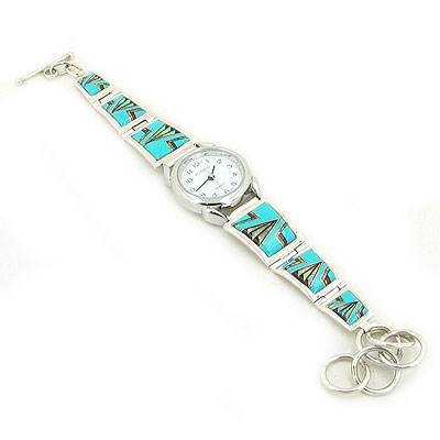 Featuring a beautiful .925 sterling silver lady's watch band precision inlaid with Sleeping Beauty Turquoise, Created White Fire Opals & Onyx stones. The watch case is our classic white by PUEBLO.