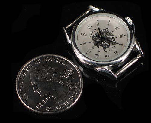Featuring a classic lady's 1911 Native American Chiefhead watch case. It has a width of 1" with 12 mm pins (included) and new battery. The distance between pin is 21 mm.
