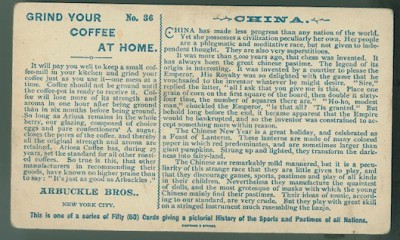 Original Arbuckle coffee chromo card showing a scene from China. The size is 7.5x12.5cm (3x4.9").