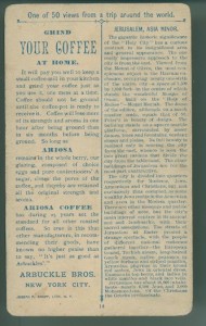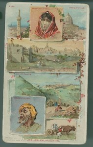 Original Arbuckle coffee chromo card showing types and scenes from Jerusalem. The size is 7.5x12.5cm (3x4.9").