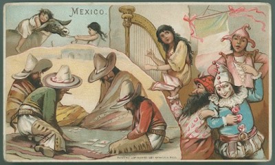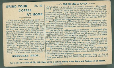 Original Arbuckle coffee chromo card showing types and scenes from Mexico. The size is 7.5x12.5cm (3x4.9").