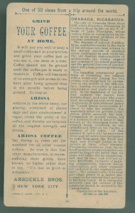 Original Arbuckle coffee chromo card showing types and scenes from Nicaragua. The size is 7.5x12.5cm (3x4.9").