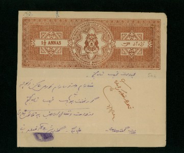 INDIA BHOPAL STATE TYPE 502 1 1/2A STAMP PAPER REVENUE. FULL SIZE DOCUMENT. I have a huge collection of Indian Revenues and Court Fees but since i don't know the current prices, i use a catalogue of 1983.