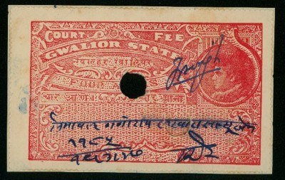 INDIA GWALIOR STATE 4As COURT FEE. I have a huge collection of Indian Revenues and Court Fees but since i don't know the current prices, i use a catalogue of 1983.