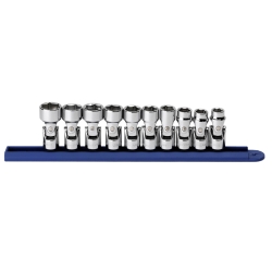 Set includes: 10mm; 11mm; 12mm; 13mm; 14mm; 15mm; 16mm; 17mm; 18mm and 19mm 3/8" drive metric 6 point flex sockets. Packaged in a socket rail.