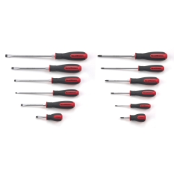 12 Piece Combination Screwdriver Set includes 1/4" x 1-1/2"; 3/16" x 6" with Cabinet Tip; 1/4" x 4" with Bolster; 1/4" x 6" with Bolster; 5/16" x 6" with Bolster; 3/8" x 8" with Bolster; No. 0 x 2-1/2"; No. 1 x 3"; No. 1 x 6"; No. 2 x 1-1/2"; No. 2 x 4" with Bolster; No. 3 x 6" with Bolster. Packaged in a tray.