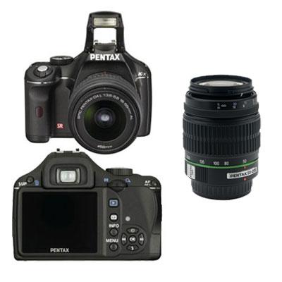 Pentax K-x 12.4 MP Digital SLR with 2.7-inch LCD and 18-55mm f/3.5-5.6 AL and 50-200mm f/4-5.6 ED Lenses (Black). The Pentax K-x offers high-end features including Live View, HD video and photographic performance that challenges higher class models. Since there's no rule that SLR cameras must come in one color, try the K-x in a choice of white or black, as well as special, limited edition red and navy. With a one-handed shooting design that is extremely compact, lightweight, and easy-to-use, the very affordable K-x is perfect for users stepping up from a point-and-shoot digital camera to their first digital SLR.