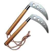 About This Item These 10 inch long wooden handles have a beautiful natural color. 7 inch polished, vented steel blades. Leather thong wrist cord. Disclaimer: All weapons are for demonstration or decorative purposes only. If used for demonstration, expert care and supervision should be exercised.