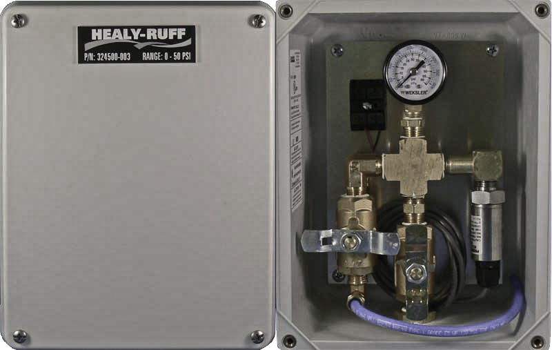 A NEMA 4X non-metallic enclosure houses the Roto-Tran IV pressure transducer, block and bleed valve and pressure gauge.
