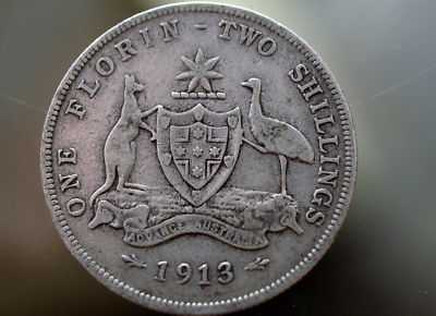 Australia 1913 .925 Silver Florin Two Shilling Coin