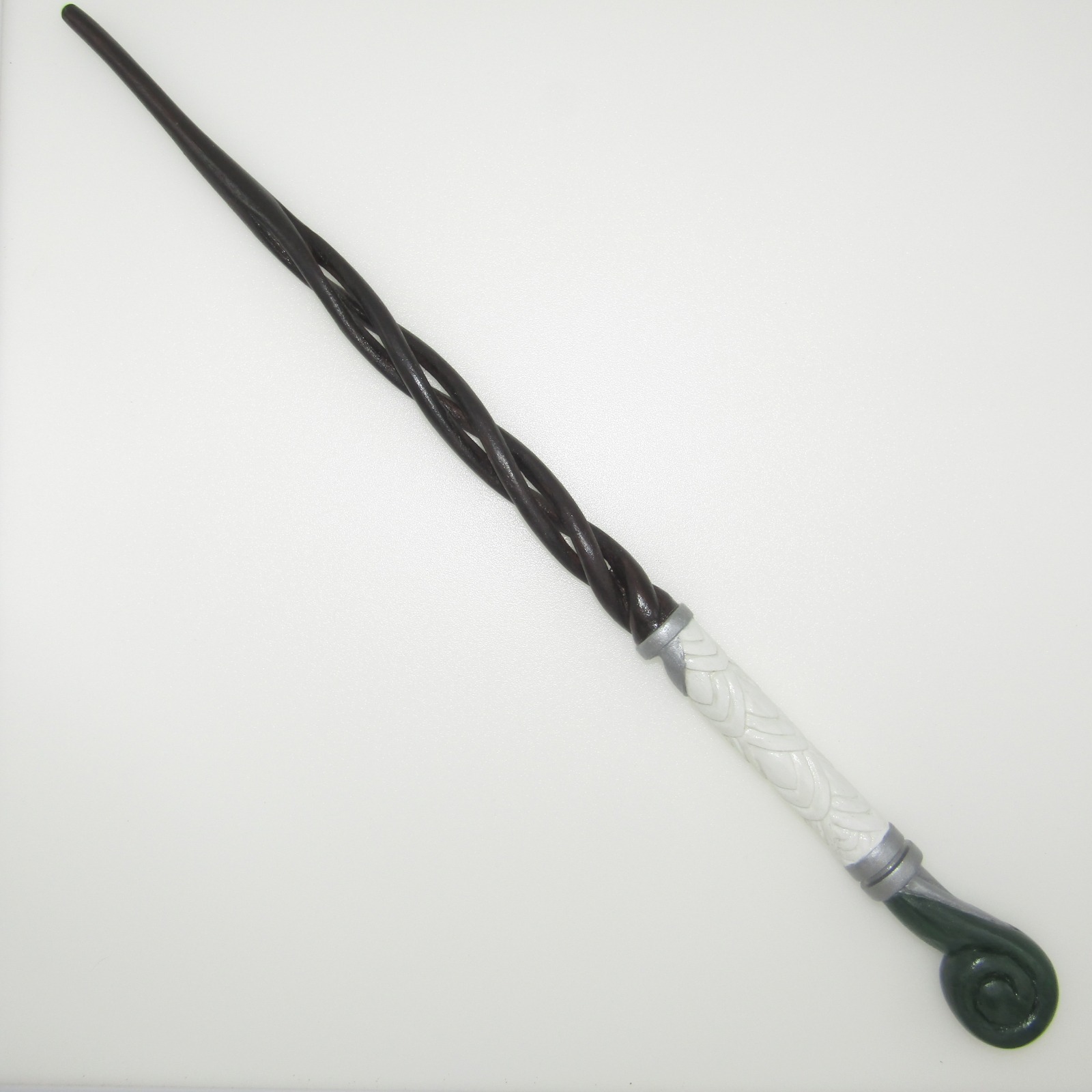 This listing is for a hand turned and carved solid teak wood magic wand. The wand measures 16 inches in overall length with a 10-inch tapered spiral shaft that features multiple spirals at the base of the shaft that run 6 3/4-inches up the shaft, 6-inch handle that features a shell design pommel and scaled design details on the grip, with an approximate 1 1/4-inch width at the widest point, finished with natural pigments and metallic silver with a durable high gloss luster coat, and the wand includes a velvet cloth storage bag.