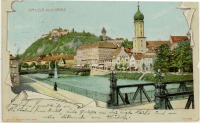 Card shows Graz river view of bridges and city.