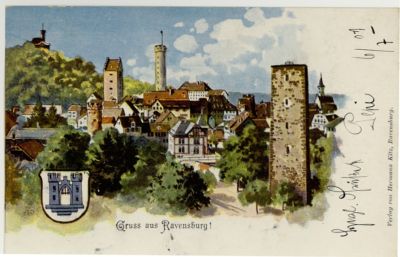 City with multiple towers including one on a hill in the distance. Shield with castle on it.