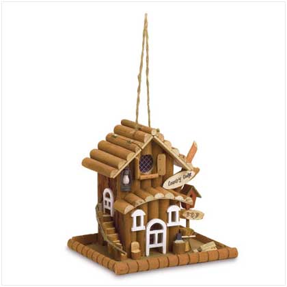 Country-cute with hinged log-style roof, miniature staircase and bright white trim - it even has a courtyard big enough to hold the whole feathered family! Wood with rope for hanging. 9 1/2" x 7 3/4" x 9" high.